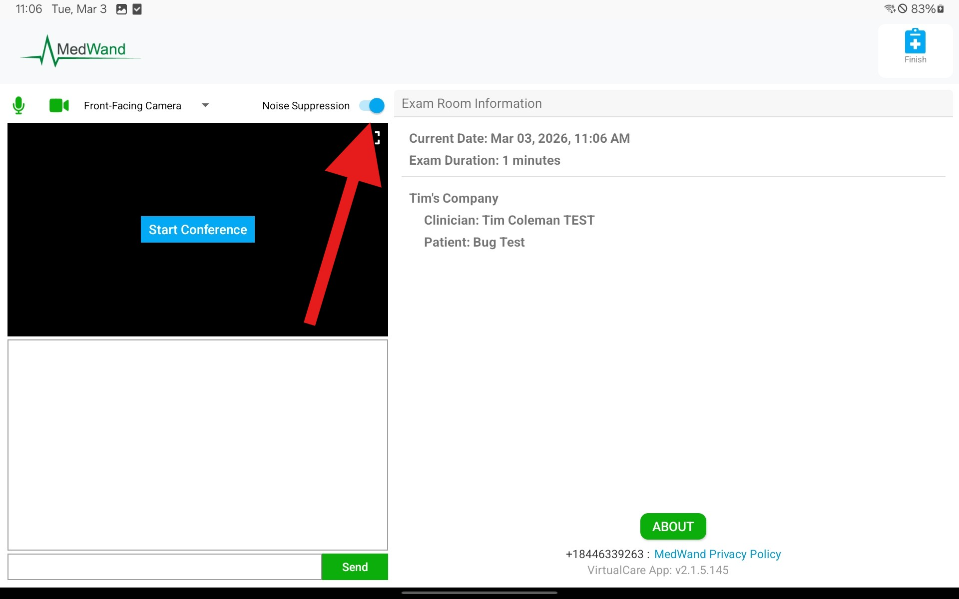 Short-Term Solution: If you are experiencing this audio abnormality, it can be fixed at this time by having the patient turn off "Noise Suppression" in the MedWand VirtualCare App. Patients can find this toggle switch in the top right corner of the video conference box (see attached reference photo).